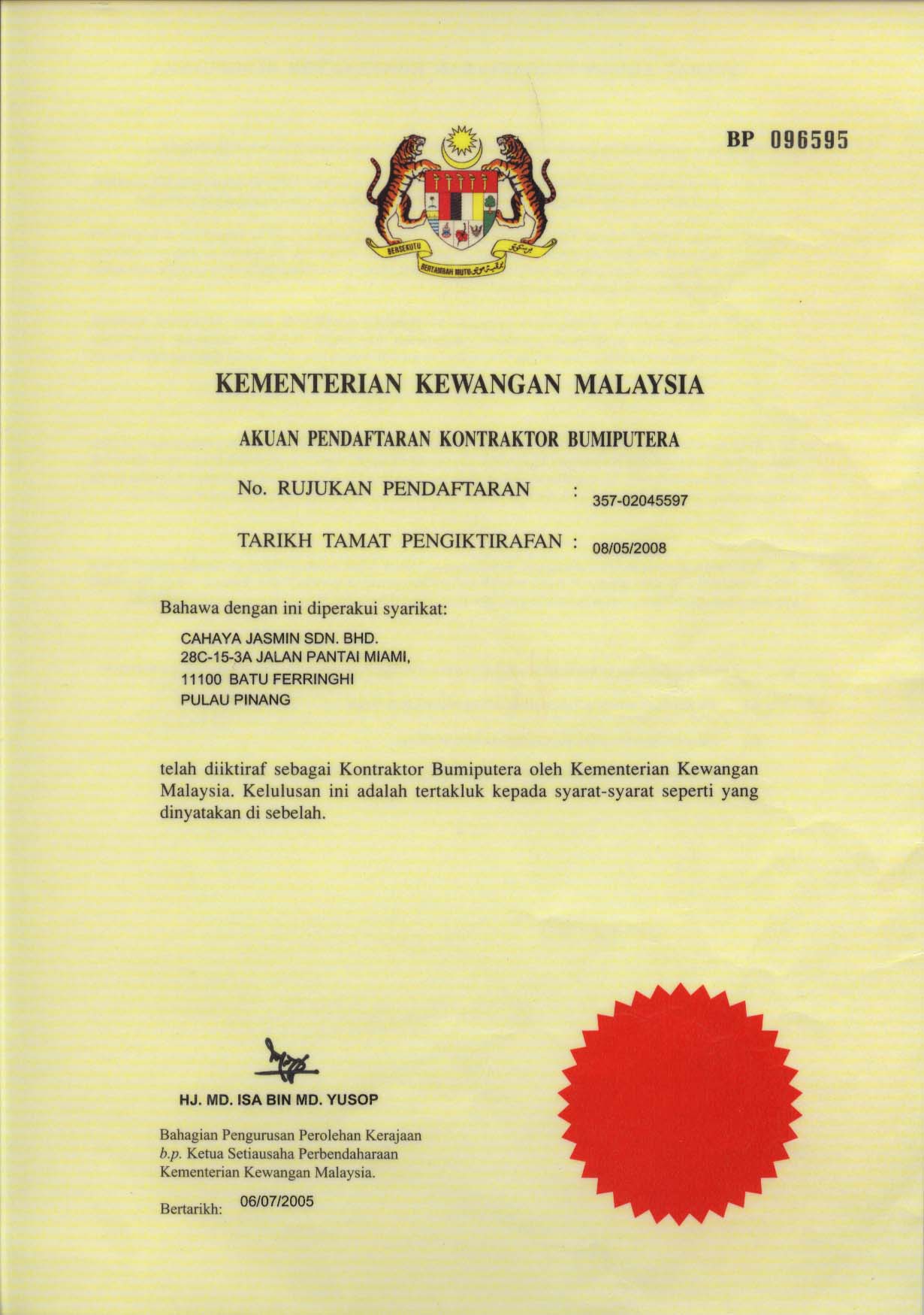 as per Bumiputra Certificate no. 184009 issued by the Ministry of Finance